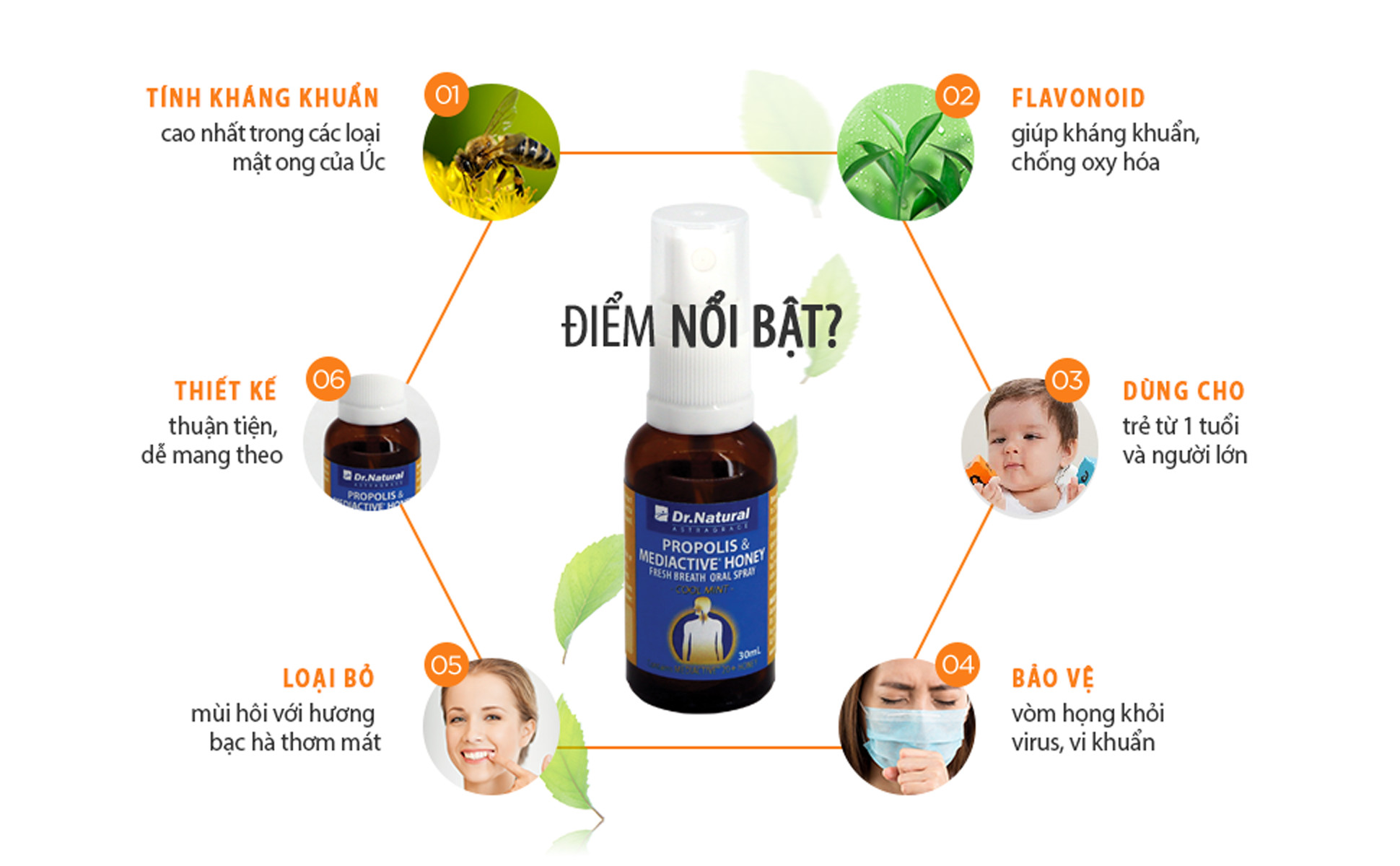 KEO ONG XỊT HỌNG ÚC PROPOLIS & MEDIACTIVE HONEY FRESH BREATH ORAL là keo ong xịt họng hàng đầu của Úc được đặc chế với công thức sát khuẩn giúp tiêu diệt vi khuẩn gây mùi và giúp ngăn ngừa cơn ho, ngứa họng, viêm họng, đau rát họng hiệu quả. Chi tiết sản phẩm TẠI ĐÂY