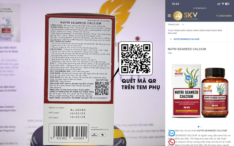 Sử dụng camera điện thoại thông minh hoặc Zalo để quét mã QR tích hợp trên tem phụ sản phẩm, kết quả truy xuất thông tin chi tiết sản phẩm trên website của công ty Sức Khỏe Vàng - Nhà nhập khẩu chính hãng các sản phẩm New Zealand, Úc, Châu Âu,.. tại Việt Nam.