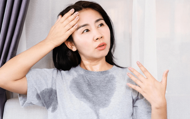 Bốc hỏa, đổ mồ hôi ban đêm: Cơn bốc hỏa là cảm giác nóng đột ngột lan từ ngực lên cổ và mặt, kèm theo đỏ bừng da và vã mồ hôi. Các cơn này thường xuất hiện vào ban đêm, gây đổ mồ hôi nhiều, làm gián đoạn giấc ngủ.