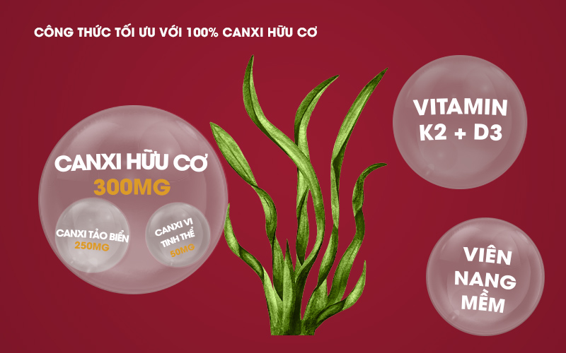 1.Thành phần 100% canxi thiên nhiên chiết xuất từ tảo biển New Zealand hấp thu tốt nhất trong các loại canxi hữu cơ, không gây táo bón hay lắng cặn.