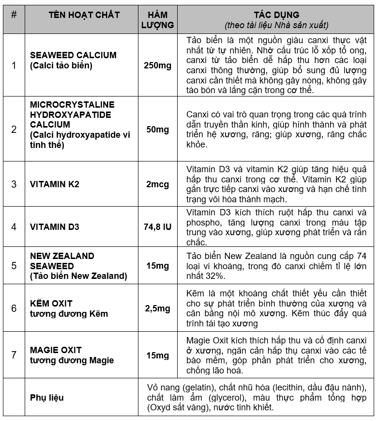 1.Thành phần 100% canxi thiên nhiên chiết xuất từ tảo biển New Zealand hấp thu tốt nhất trong các loại canxi hữu cơ, không gây táo bón hay lắng cặn.