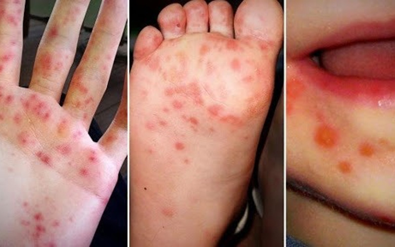 Tổn thương da: Xuất hiện các nốt phát ban, mụn nước nhỏ trên nền da đỏ ở vùng miệng, lòng bàn tay, lòng bàn chân, mông hoặc đầu gối. Các nốt này thường không ngứa nhưng có thể gây đau.