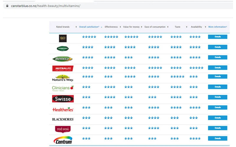 Trên đây là kết quả khảo sát năm 2011 của hãng nghiên cứu thị trường danh tiếng Canstar Blue. Họ thu thập ý kiến của người tiêu dùng New Zealand đánh giá các thương hiệu thực phẩm bảo vệ sức khỏe theo các tiêu chí: Mức độ hài lòng tổng thể (Overall Satisfaction), Dễ mua (Availability), Dễ sử dụng (Ease of Consumption), Hiệu quả (Effectiveness), Mùi vị (Taste) và Giá trị đích thực (Value for Money)
