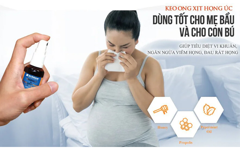 Theo các bác sỹ sản khoa, việc sử dụng keo ong xịt họng giúp tiêu diệt vi khuẩn phòng ngừa cảm cúm, giảm đau rát họng, ho...hạn chế dùng thuốc cho các mẹ bầu rất được khuyên dùng.