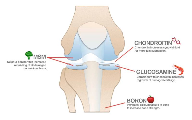Glucosamin đã được chứng minh là thành phần cực kỳ quan trọng với xương khớp. Hợp chất này được tìm thấy trong các mô sụn. Hợp chất này được cấu tạo bởi glucose và amino acid glutamine. Khi thiếu hợp chất này, sụn sẽ dễ bị giòn gây viêm khớp.