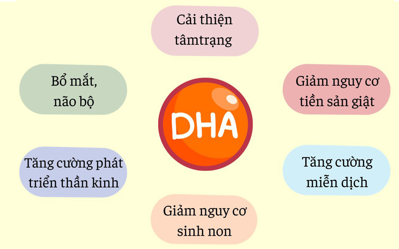Tăng trưởng thể chất: DHA có liên hệ mật thiết với chu vi vòng đầu, chiều cao và cân nặng của trẻ sơ sinh. Thiếu hụt DHA trong thai kỳ được chứng minh làm tăng nguy cơ sinh non, nhẹ cân và chậm phát triển thần kinh.\