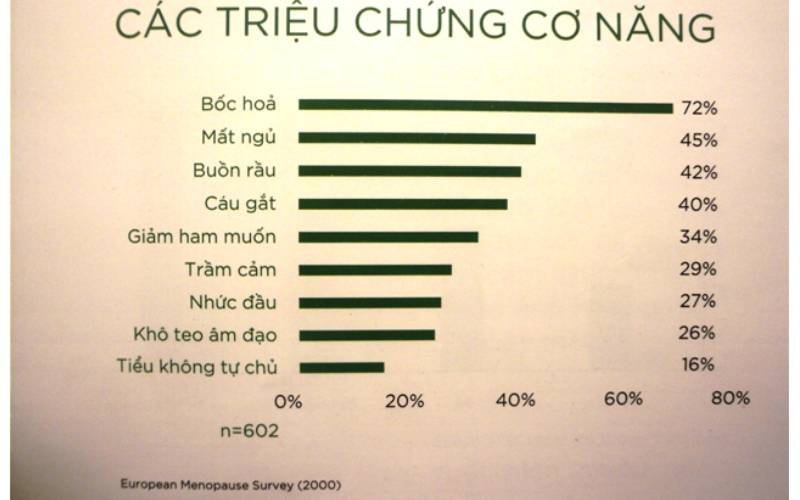 Thường xuất hiện các triệu chứng như: bốc hỏa, đổ mồ hôi, rối loạn giấc ngủ, suy giảm trí nhớ, rối loạn chức năng tình dục…và sau khoảng thời gian 1-2 năm sẽ chuyển sang giai đoạn mãn kinh