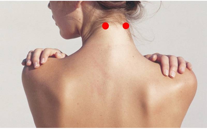 Huyệt Phong trì: Dùng hai ngón tay cái day ấn vào chỗ lõm dưới xương chẩm, bên ngoài khối cơ nổi sau cổ (khi ấn có cảm giác tức nặng). Day mỗi bên 1 phút.