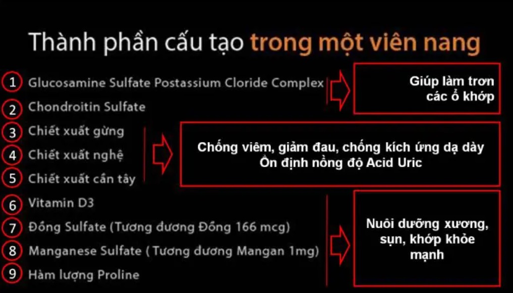 Với Công thức vượt trội 9 thành phần kết hợp Glucosamine Sulfate, Chondroitin và các dưỡng chất nuôi dưỡng xương, khớp, sụn, cơ. Glucosamine Sulfate 1,500mg kết hợp Nghệ & Gừng tăng cường chống viêm cho ổ khớp và chống kích ứng dạ dày; kết hợp Đồng, Mangan và Proline tăng cường chắc khỏe hệ cơ-gân-xương & hỗ trợ cân bằng nồng độ acid uric.